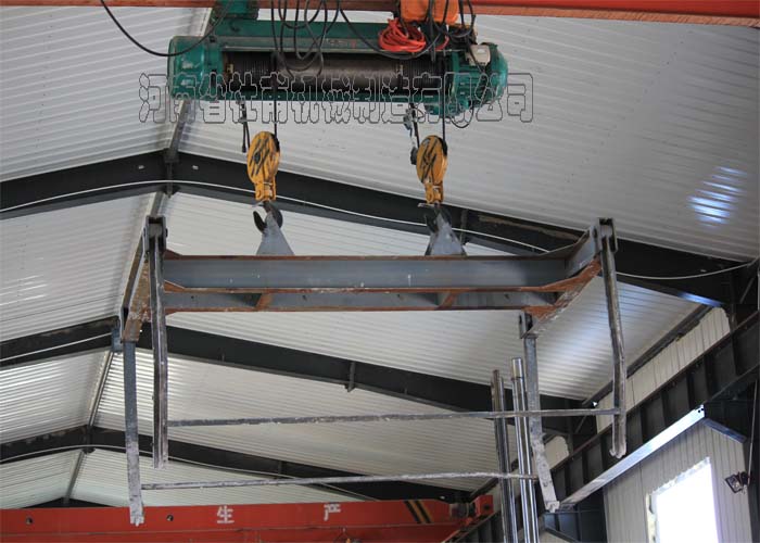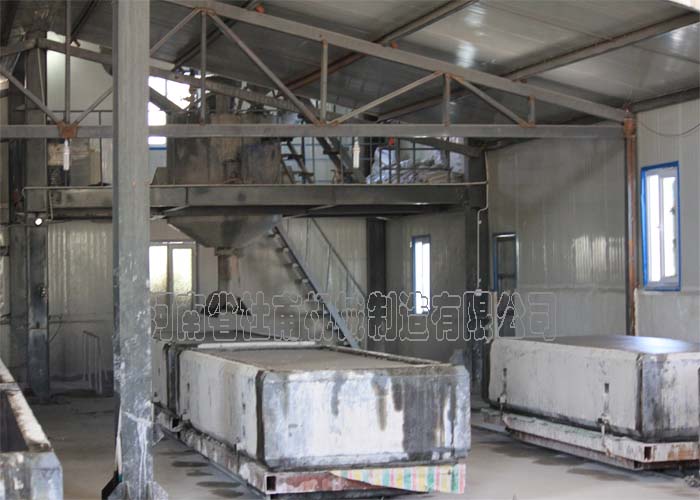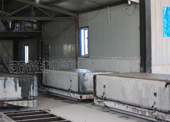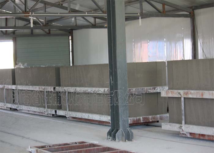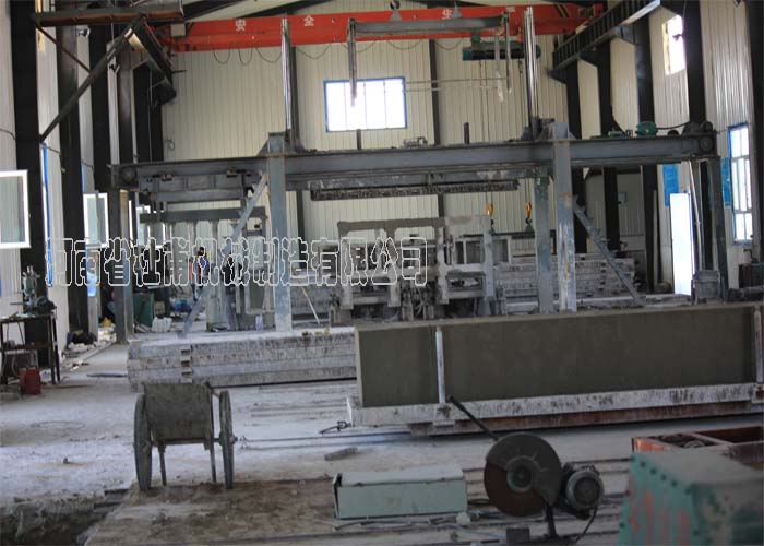 翻轉吊具把模具空中翻轉90度以后脫模把坯體連同模具側板放置在切割臺上,縱向切割裝置通過電機帶動自身行走,對放置于切割臺上的坯體進行行走切割,切割完成后行走至暫停位置,橫向切割裝置通過電機帶動自身行走到坯體中央停止后再進行水平式切割,橫切架自上而下垂直降落切割直至上升復位
