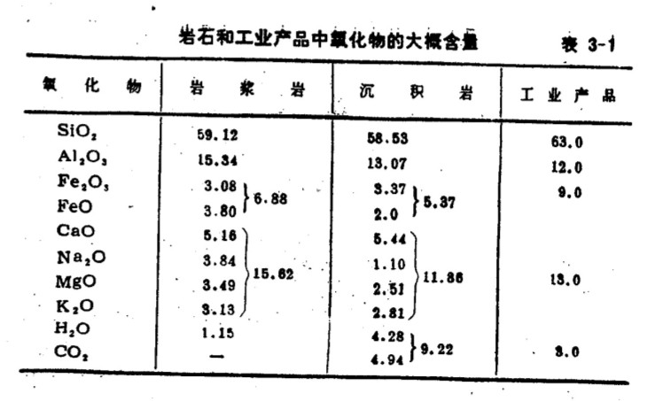 下圖表列出了巖石和工業產品中氧化物的大概含量: