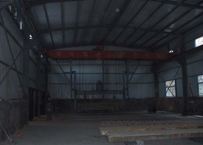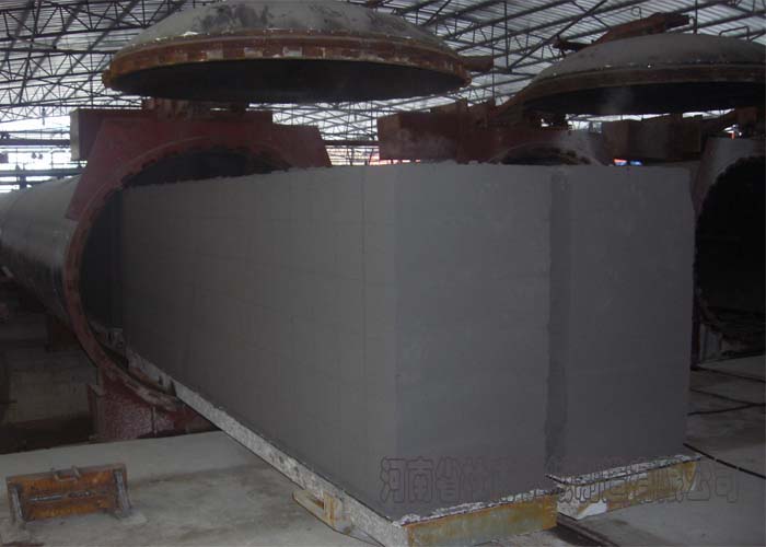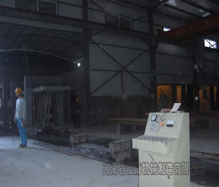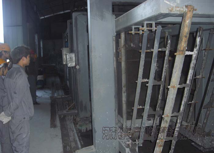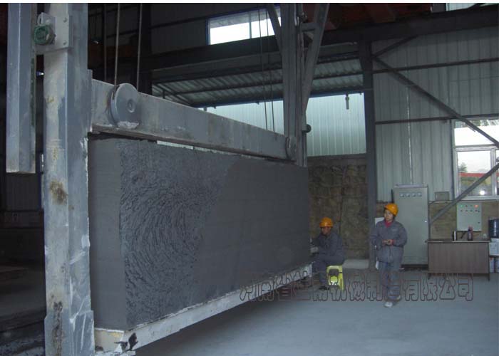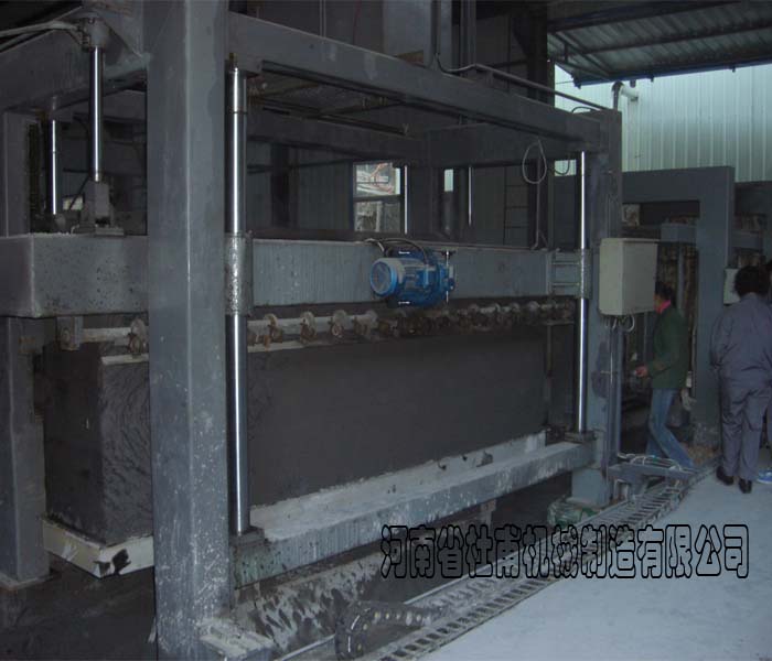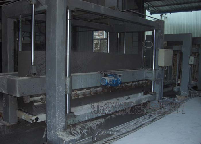 翻轉(zhuǎn)吊具把模具空中翻轉(zhuǎn)90度以后脫模把坯體連同模具側(cè)板放置在切割臺上,縱向切割裝置通過電機帶動自身行走,對放置于切割臺上的坯體進行行走切割,切割完成后行走至暫停位置,橫向切割裝置通過電機帶動自身行走到坯體中央停止后再進行水平式切割,橫切架自上而下垂直降落切割直至上升復位