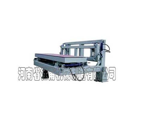 翻轉(zhuǎn)臺通過定點吊車和吊具將坯體連同模底板吊放在大滑車車架上,將坯體連同模底板翻轉(zhuǎn)90度,并將直立的坯體推進到切割位置。地面翻轉(zhuǎn)臺是去掉切割成型坯體底部廢料的專用設(shè)備。翻轉(zhuǎn)臺主要有反轉(zhuǎn)架、坯體小車、側(cè)板小車、移動裝置、壓桿、滾輪、翻轉(zhuǎn)座、及支座等組成。其反轉(zhuǎn)、移動均由液壓缸控制。 |