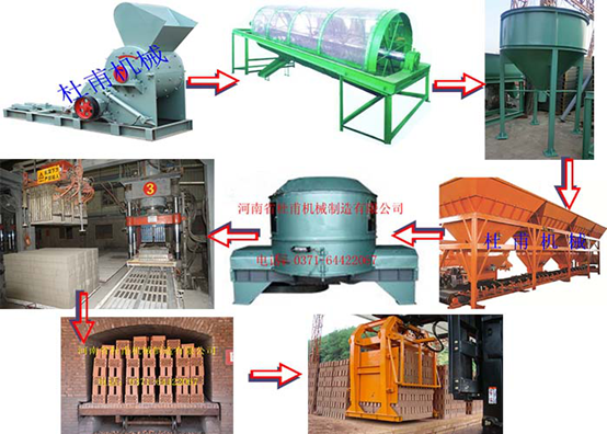 利用液壓磚機來生產粘土磚是我公司根據真空磚機制磚的種種缺陷,結合國內具體國情研制出的簡單而又高效的制磚工藝。首先將頁巖、煤矸石等進行破碎處理,然后采用科學配比用輪碾機攪拌,攪拌好的混合料選用全自動液壓磚機壓制成型,成型后的磚坯由全自動碼磚機碼垛,然后放到窯車上入窯燒結,產品包裝檢驗合格后方可出廠。