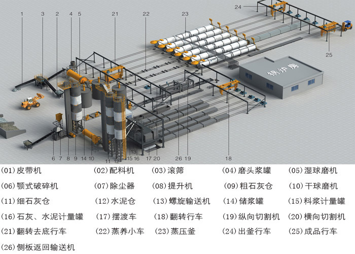 蒸壓養護系統設備:蒸壓釜,自動化控制系統、模箱系統自動裝置,自動切割系統,中央控制系統,控制系統電纜和橋架,搬運吊車無線控制系統,電腦監控系統