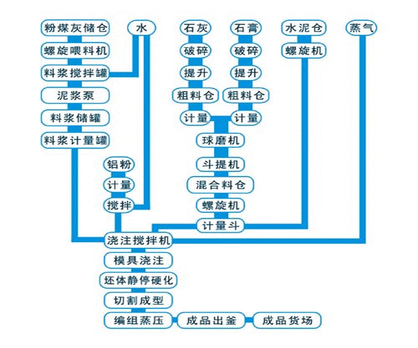 原材料均由汽車運入廠內,粉煤灰(或砂、石粉)在原材料場集中,使用時用裝運入料斗。袋裝水泥或散裝水泥在水泥庫內儲存。使用時用裝運入料斗。化學品、鋁粉等分別放在化學品庫、鋁粉庫,使用時分別裝運至生產車間。