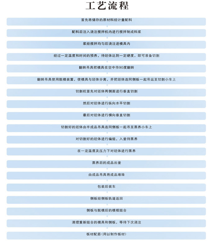 加氣塊設備可以根據原材料類別、品質、主要設備的工藝特性等,采取不同的工藝進行生產。但一般情況下,將粉煤灰或硅砂加水磨成漿料,加入粉狀石灰,適量水 泥、石膏和發泡劑,經攪拌后注入模框內,靜氧發泡固化后,切割成各種規格砌塊或板材,由蒸養車送入蒸壓釜中,在高溫飽和蒸氣養護下即形成多孔輕質的加氣混凝土制品。 主要分為以下五個階段:
