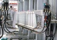 翻轉吊具把模具空中翻轉90度以后脫模把坯體連同模具側板放置在切割臺上,縱向切割裝置通過電機帶動自身行走,對放置于切割臺上的坯體進行行走切割,切割完成后行走至暫停位置,橫向切割裝置通過電機帶動自身行走到坯體中央停止后再進行水平式切割,橫切架自上而下垂直降落切割直至上升復位